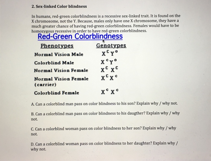 A woman with normal vision whose father is color blind c) all of the traits that mendel studied—seed color, pod shape, flower color, and others—are due to genes linked on the same chromosome.